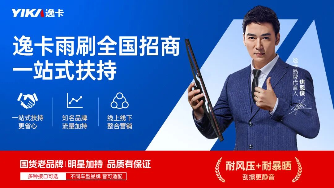 逸卡雨刷由焦恩俊代言,在全网统一零售价均为69元,线上有对标价格,车主不用担心,线下购买的雨刷线上会更便宜而觉得自己吃亏,车主更加忠实于门店的消费,明码标价,品牌知名度高,品牌综合排行第一,抖音销量第一逸卡雨刷获得消费者喜爱奖、最具实力奖、最具品牌影响力奖,并且逸卡拥有多位头部达人鼎力推荐:疯狂小杨哥、五号车库阿张、盟主安全官、大鲜汽车讲堂等,合作逸卡雨刷,门店无需进行雨刷的推销,车主进店就能看到逸卡的特色展架、海报、横幅等物料,让客户进店自发进行更换,提升自然转化成交。