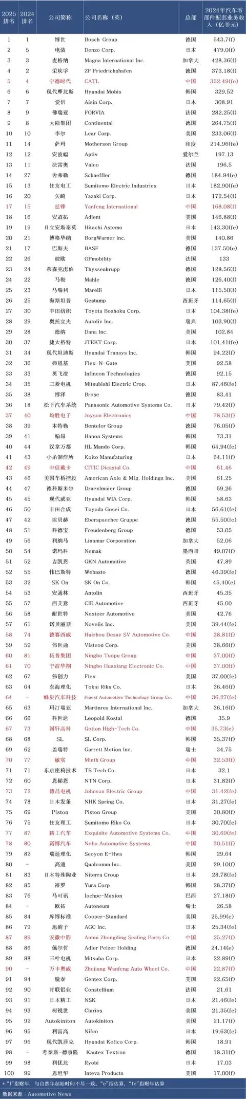 ![]() 2025年全球汽车零部件百强榜的发布,不仅是一场企业排名的更迭,更折射出产业链深度变革的信号——中国零部件企业以15家上榜、10家营收逆势增长的强势表现,成为暗淡市场中少见的亮色(宁德时代第5、德赛西威营收涨25%、宁波拓普涨33%)。这一变化正悄然重塑汽车后市场的竞争逻辑与生态格局。 ![]() 一、中国供应链崛起,后市场渠道与产品结构生变